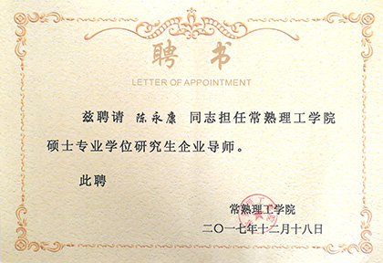 祝賀公司董事長陳永康先生被聘請(qǐng)為常熟理工學(xué)院碩士專業(yè)學(xué)位研究生企業(yè)導(dǎo)師