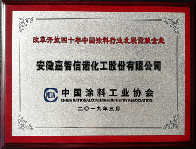 熱烈祝賀安徽嘉智信諾化工股份有限公司被中國(guó)涂料工業(yè)協(xié)會(huì)授予“改革開放四十年中國(guó)涂料行業(yè)發(fā)展貢獻(xiàn)企業(yè)”稱號(hào);