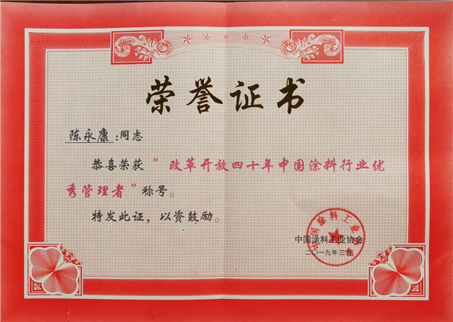 熱烈祝賀陳永康先生被中國(guó)涂料工業(yè)協(xié)會(huì)授予“改革開放四十年中國(guó)涂料行業(yè)優(yōu)秀管理者”稱號(hào)。