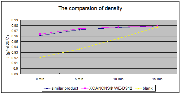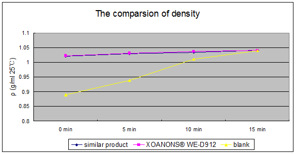 1.1 Testing method 0.2% addition in varnish, oscillation 15min, test the density at different time Density is a symbolic measurement of ability of anti-foaming and defoaming. Much more bubbles, lower density. Density value becomes higher with bubbles disappearance.