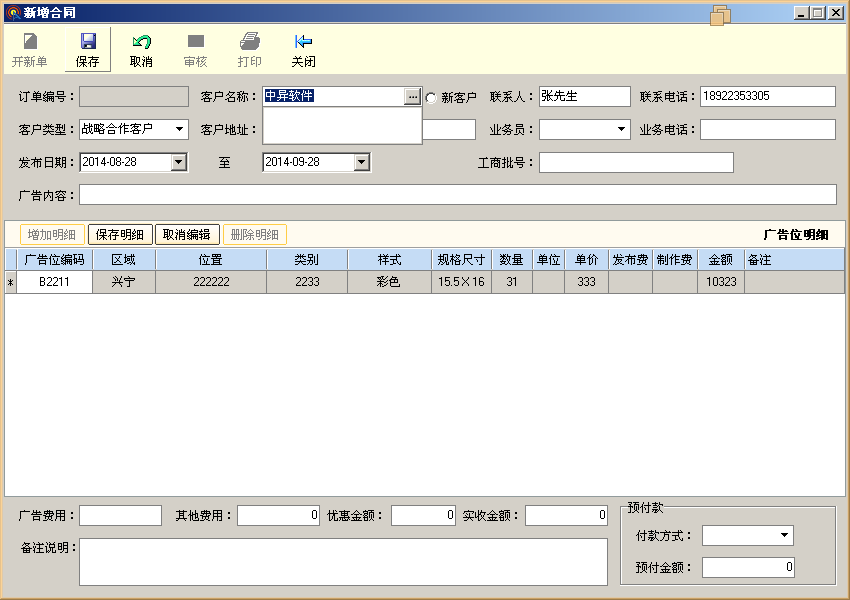 如戶外廣告、 樓宇廣告、 電梯廣告、高速廣告等廣告位管理,和客戶 往來訂單收款功能